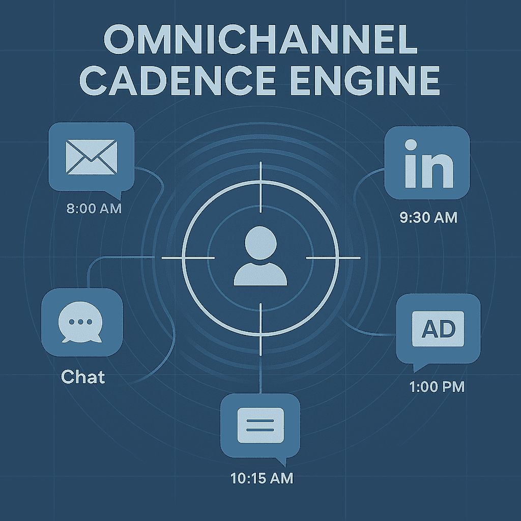 An Omnichannel Cadence Engine is a strategic system that combines timing, technology, and personalized messaging across multiple channels—email, LinkedIn, phone, digital ads, chat, and more—to reach your audience in a coordinated and consistent way.